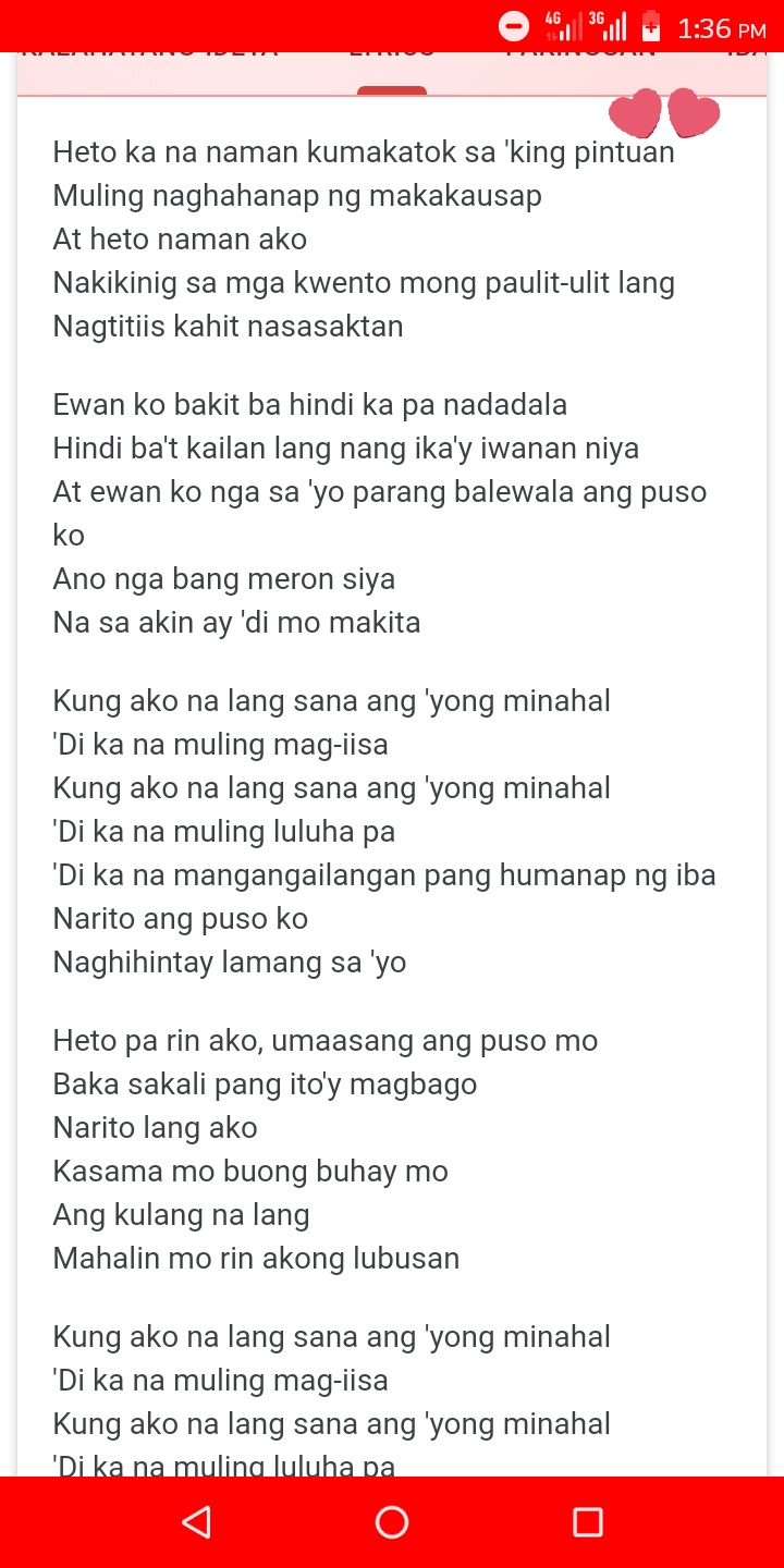 Submit lyrics correction. Verse 1 E A BG CmA Heto ka na naman kumakatok sa king pintuan AF B E DB E Muling naghahanap ng makakausap CmA BG At heto naman ako CmA DB E AF Nakikinig sa mga kwento mong paulit-ulit lang Dmaj7 B Nagtitiis kahit nasasaktan Verse 2 E A BG Cm7 Ewan ko. Nandito lang ako maghihintay.